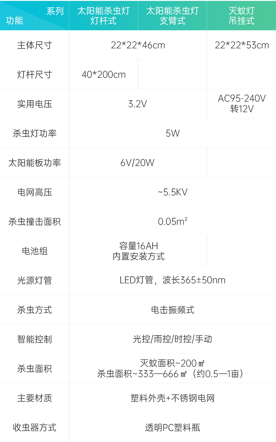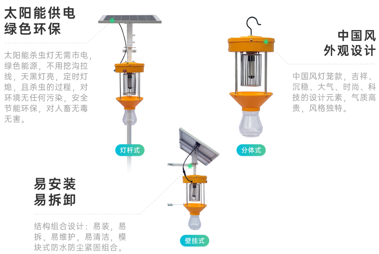 具備光控、雨控、時控 3種智能控制切換模式,實現依據晝夜、 天氣、時段變化自動控制燈光,無需人工看管也能智能殺蟲。