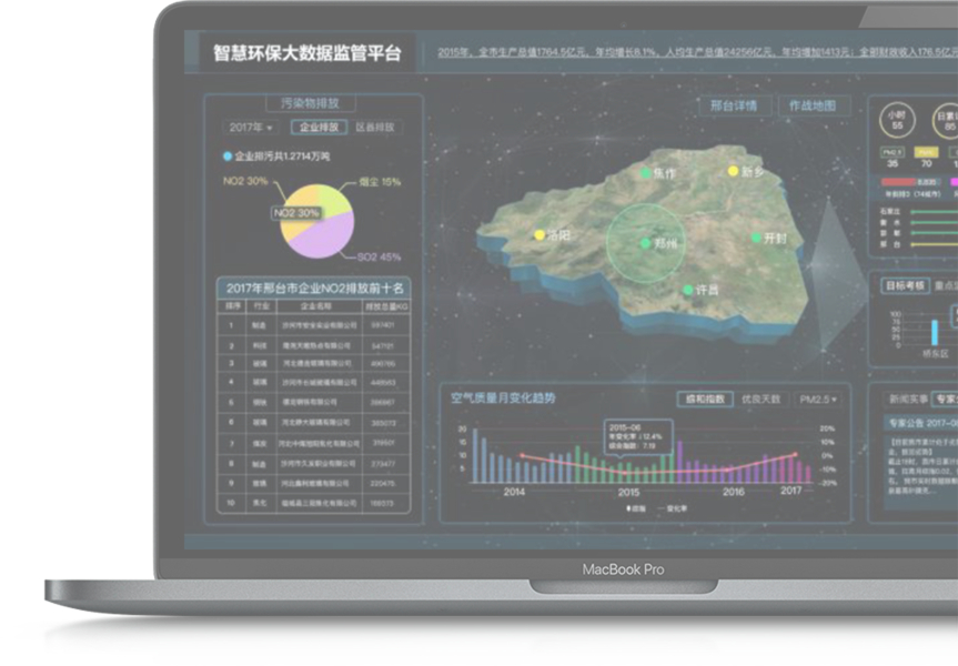 平臺按照水、氣、土、噪聲、生態等環保要素重新組織環境監測數據,以改善環境質量為目標,進行環境質量現狀的重新評估,對環境質量的發展趨勢進行評估和預警;分析環境質量和污染排放的關聯關系,追根溯源,說清污染成因。系統多級聯控,實現環保監測數據可視化呈現,環保智慧化監管,為污染治理和環境質量達標規劃提供輔助決策,促進環境質量逐步改善。